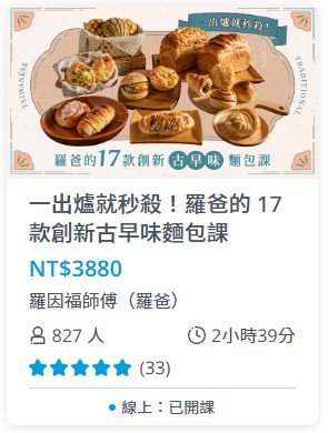 這次我學習的這堂 一出爐就秒殺!羅爸的 17 款創新古早味麵包課 ,