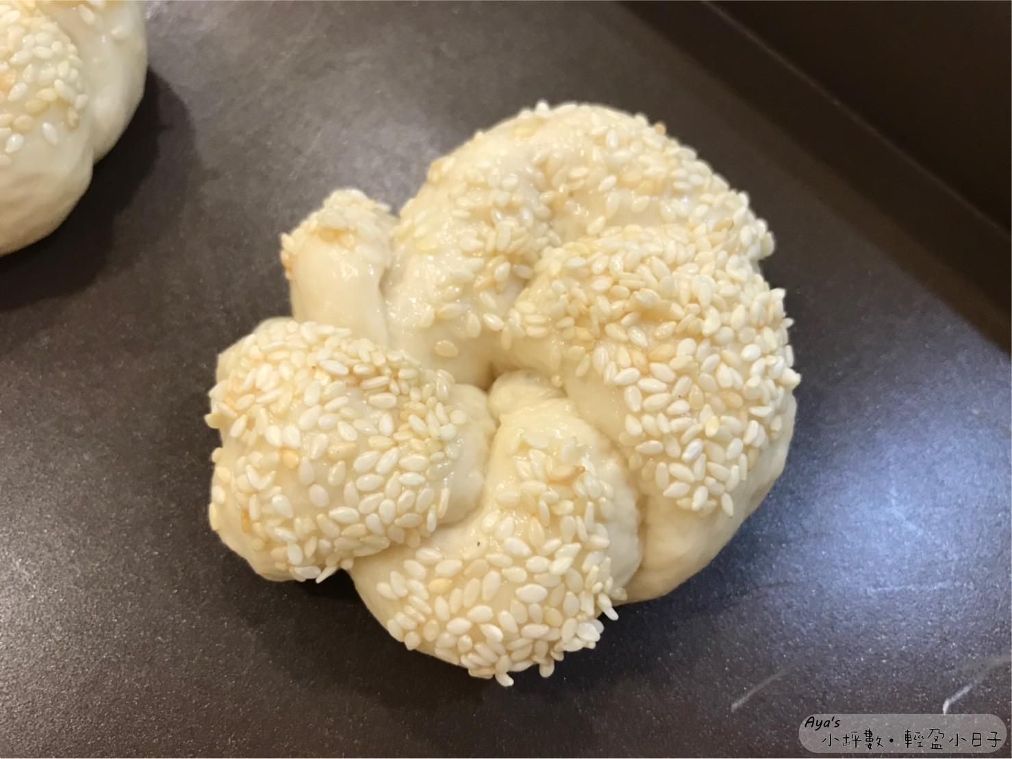 這次的蔥花麵包,老師教的是編成花狀,再沾白芝麻的方式。