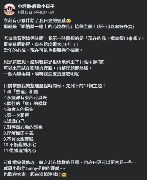 後來我哀號說日更很難,小夥伴Ginny說她想看「斷捨離一路上的心境變化」,