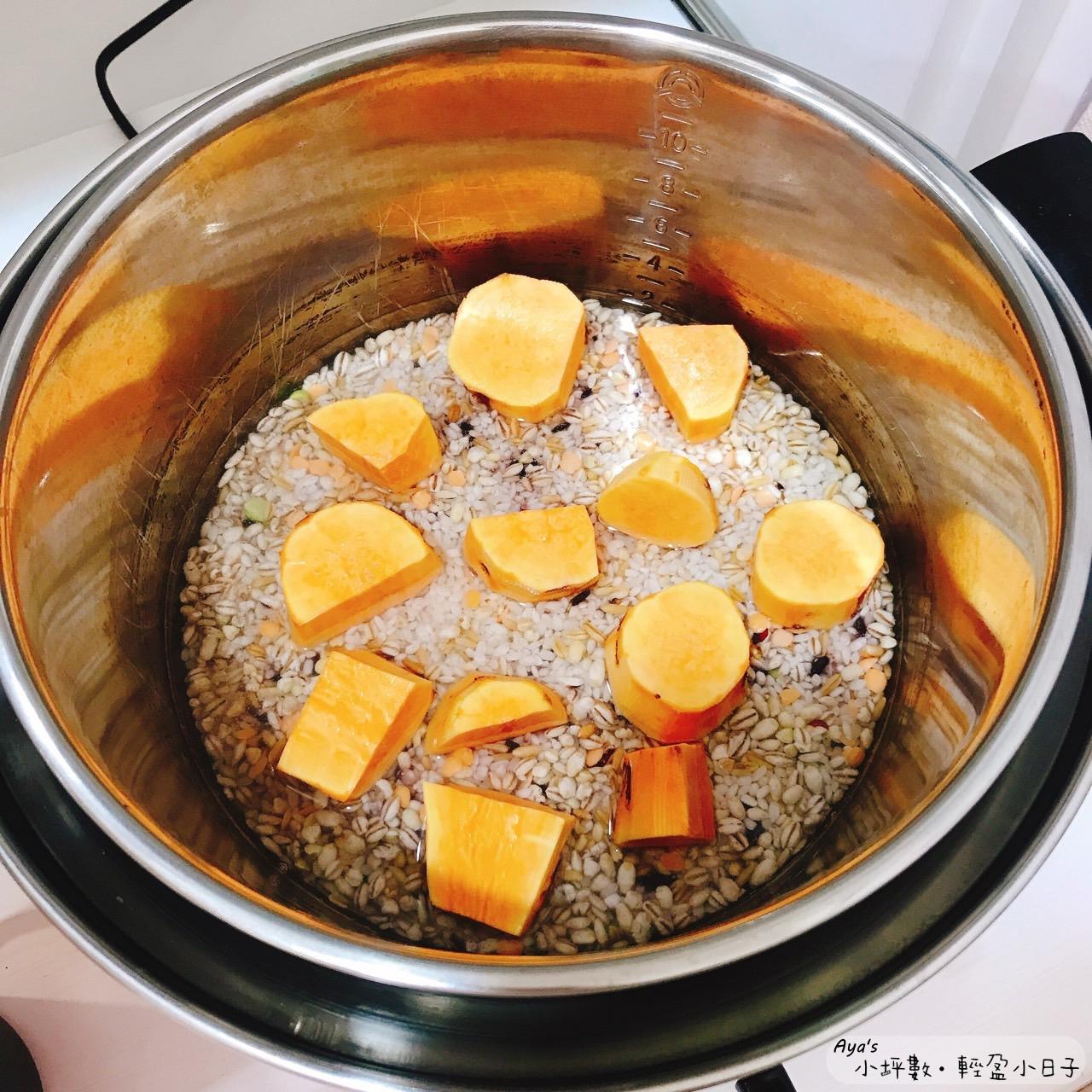 要開始蒸煮前,內鍋直接再加入五穀米(小小搖晃均勻),再加入地瓜(可省略)。