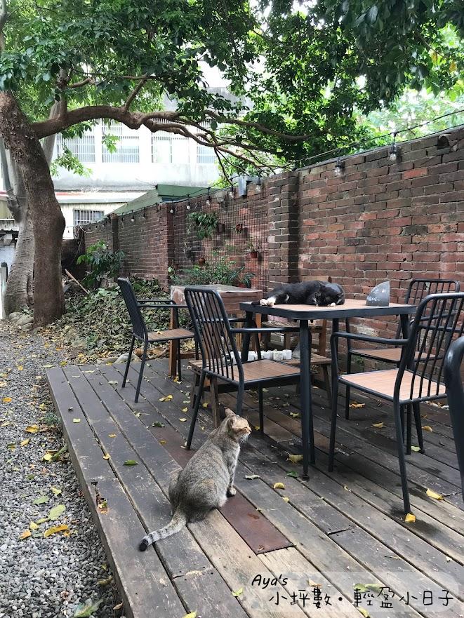 「我們。他們」咖啡廳是一間老屋,前面有種著樹的庭院,庭院中還有貓咪休息,