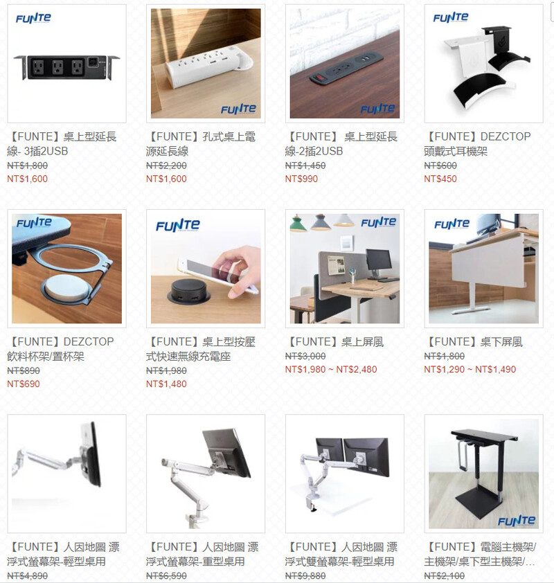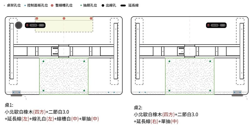 FUNTE 電動升降桌 可以自己選擇桌面顏色、桌腳顏色外,桌上的配件也可以客製,例如需要插座孔、隔板、抽屜…等等,都可以另外加購。