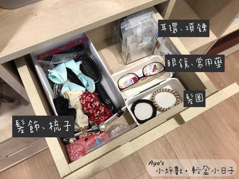 保養品和鏡子放一格 (後面還放了香水),放保養品的半透明盒子 是以前在大創買的,能把東西收納在一個「框」裡,看起來比較整齊。
