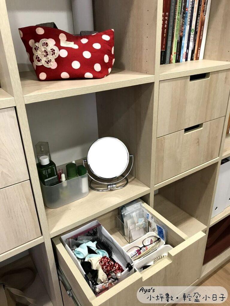 不是一定要臥室才能化妝,化妝保養品也不一定要放在臥室。就這樣我們調整了許多置物的地點,搞定了小坪數家中的收納。
