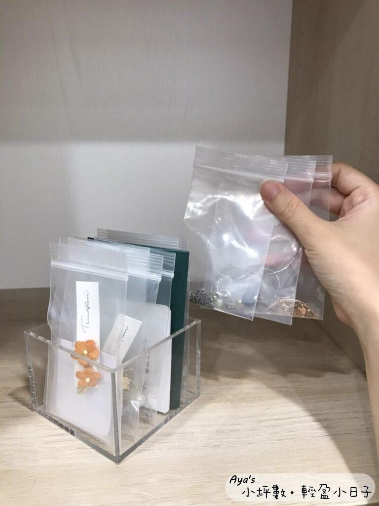 耳環和項鍊其實原本就不多,目前是用無印的可堆疊壓克力盒+有點厚度的透明袋子,分一個個物件收納。