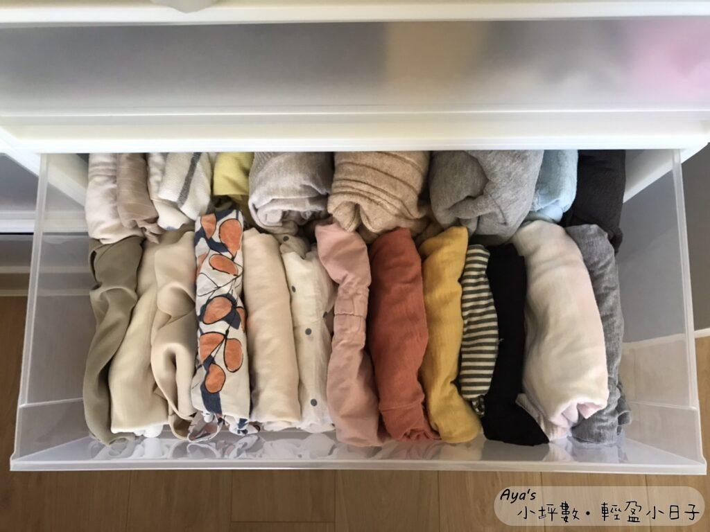 目前使用無印良品的 PP衣裝盒/橫式當作衣櫃的抽屜,直立式折法可以放兩排衣服。