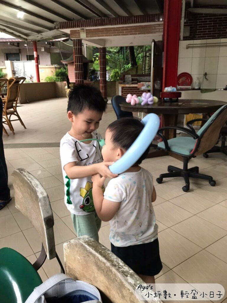 兩個外甥就拿著沒有折過的長氣球滿場飛,大概跑了有100圈吧…然後自己發明各種玩法,例如套在脖子上之類的。