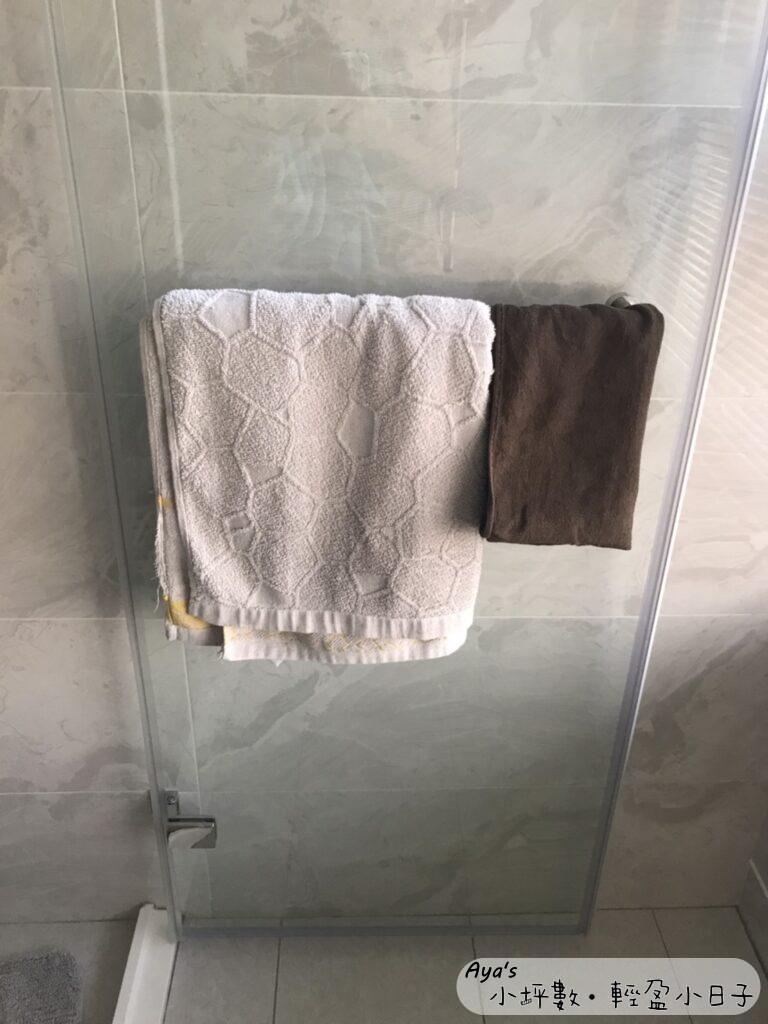 通常是男友會先洗,所以我會把他的浴巾掛在乾濕分離的玻璃門把手上,我的則先掛在一旁的架子上。