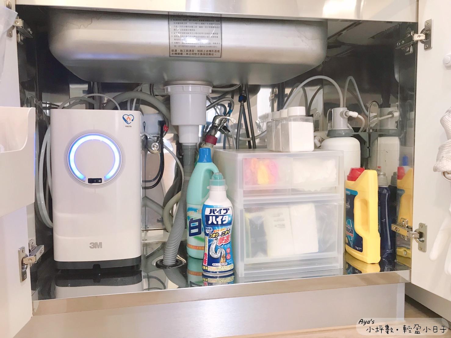 水槽櫃內,主要的大型物品是3m熱飲機的主機和濾芯(在最左和最右),