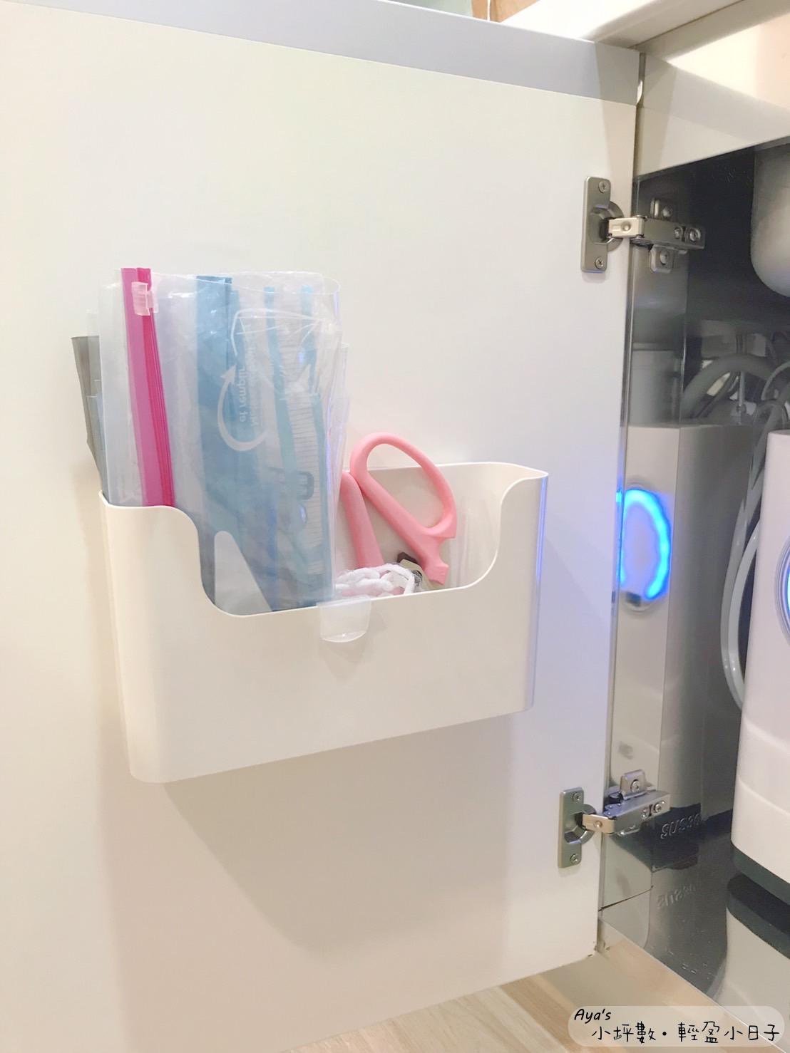 換成用無痕貼貼了一個置物盒,大小扁扁的剛好運用3m淨水器前方的小空間,