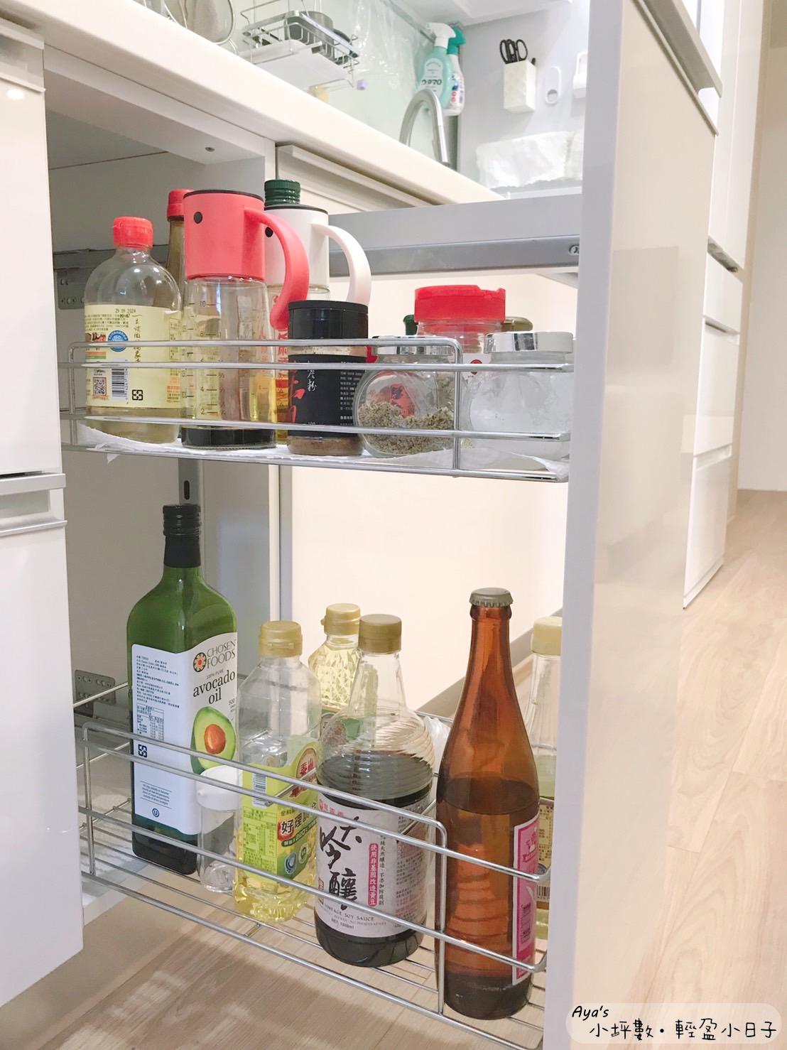 這篇僅提及一字型廚房的櫥櫃內部的收納狀況,不含中島櫃內的收納喔~(不然實在太長了)