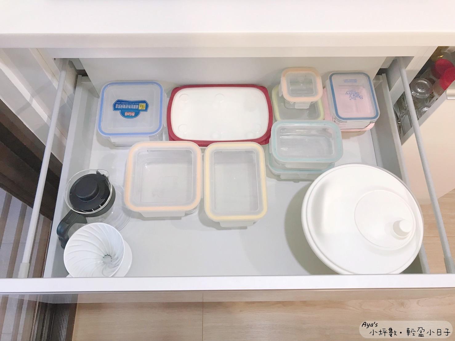 上層的大抽屜目前主要是放保鮮盒和蔬菜瀝水籃,