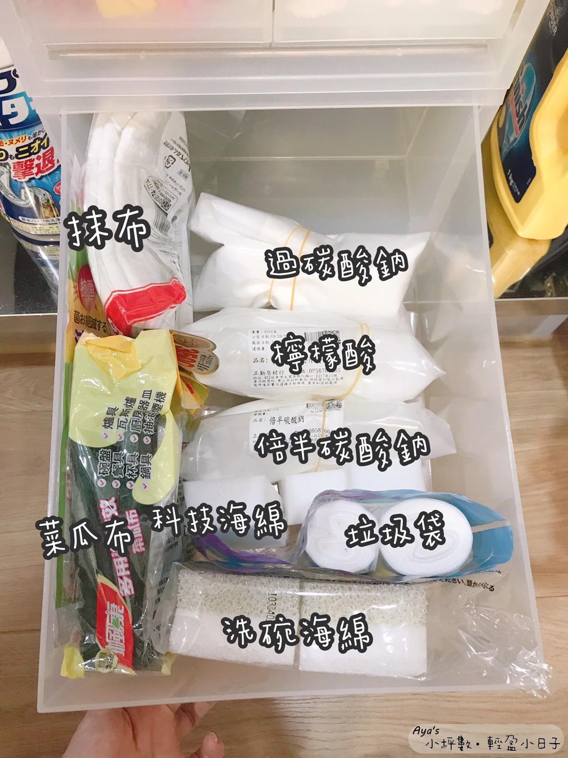 而清潔三寶(過碳酸鈉、小蘇打、檸檬酸)的粉末就用瓶裝放在抽屜櫃上方,