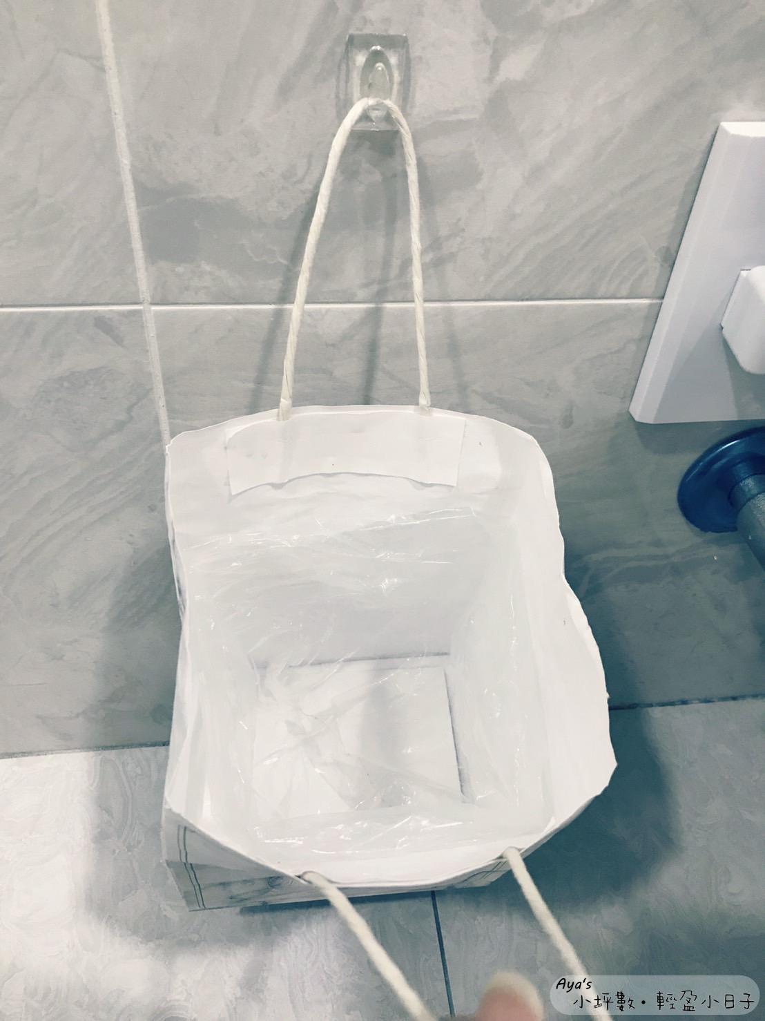 靈機一動,就在浴室貼了3M無痕迷你透明掛勾,紙袋掛上去,就是浴室的小垃圾桶。