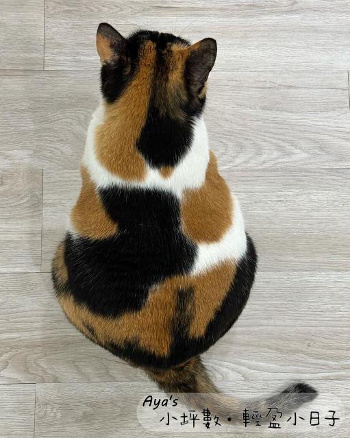 他是一隻看起來有點ㄎ一ㄤ的胖胖三花貓,背上的毛色是色塊狀,非常顯眼,