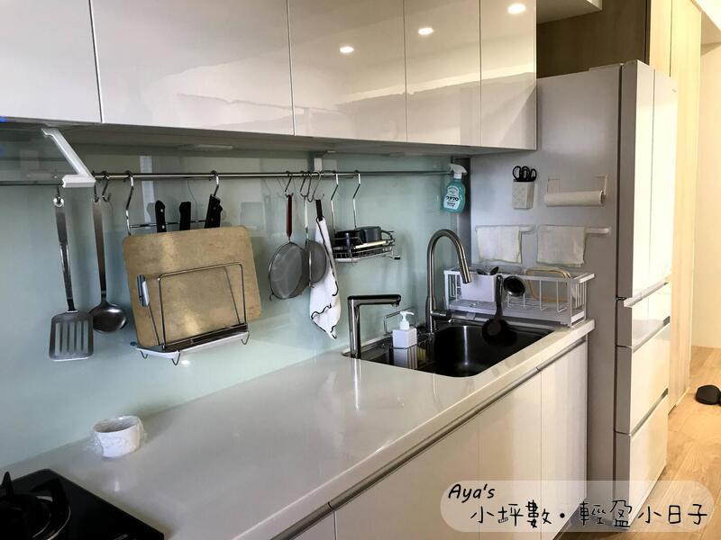 廚房我們請廠商協助鎖了一整條桿子,方便我們吊掛物品,這也是為了爭取檯面的空間,和讓檯面更容易清潔。