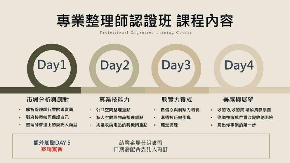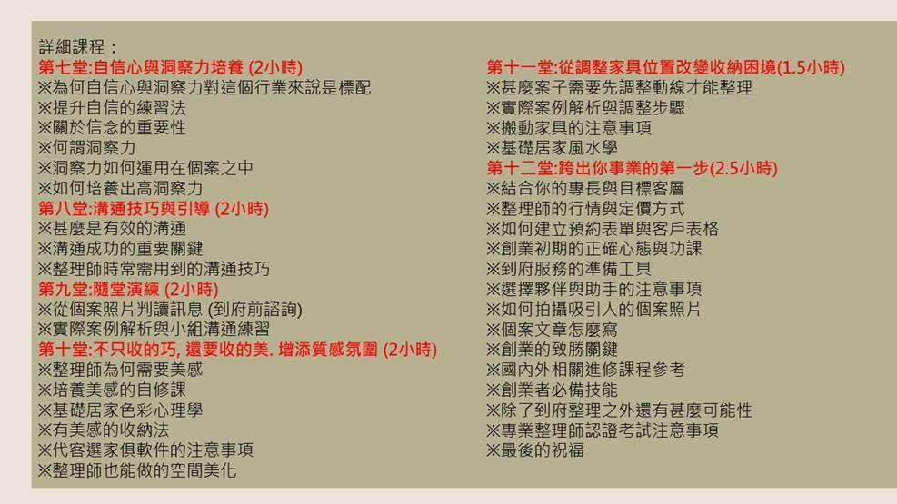 課程內容以「成為能獨立接案、有自己品牌的整理師」為主軸,